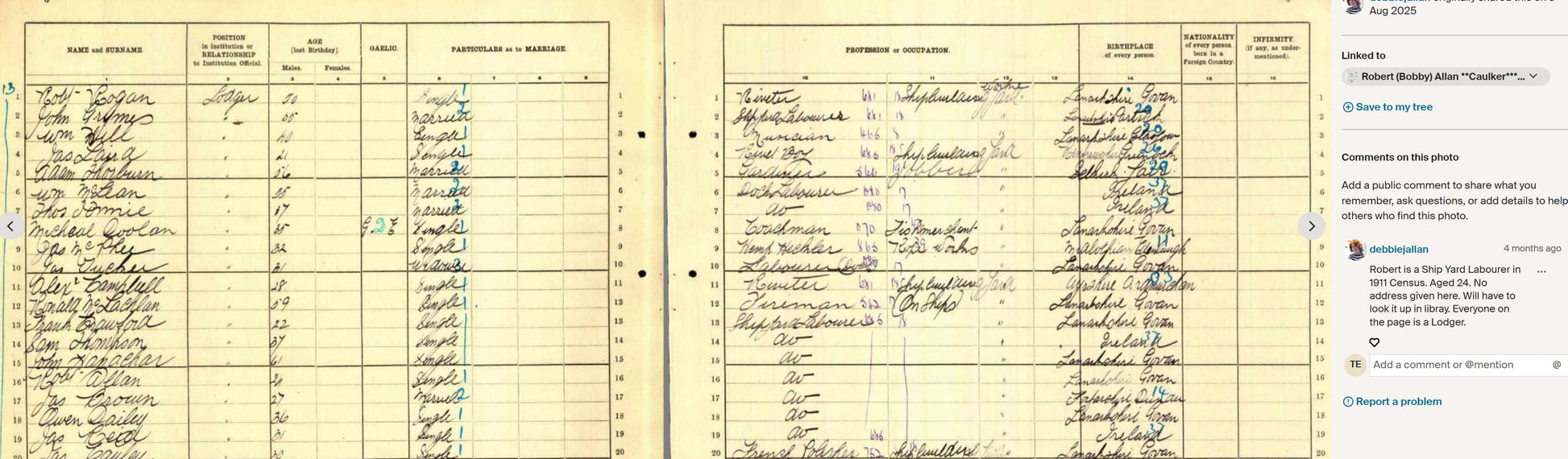 Robert Allan was born in October 1887 at Hutchesontown, Glasgow, the son of William John Allan and Elizabeth (née Hessen/Hasson). He was raised in the Govan district of Glasgow, where census records show him living with his family during his early years. By 1911 he was residing in Eythorne, Kent, recorded as a boarder, reflecting the mobile nature of his civilian employment prior to the war.