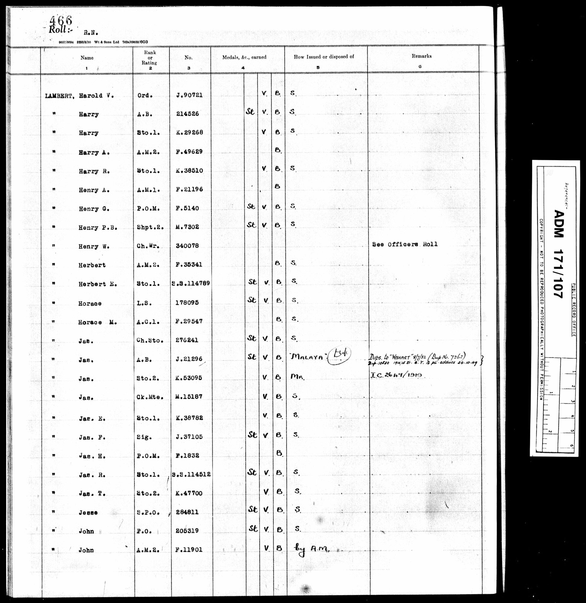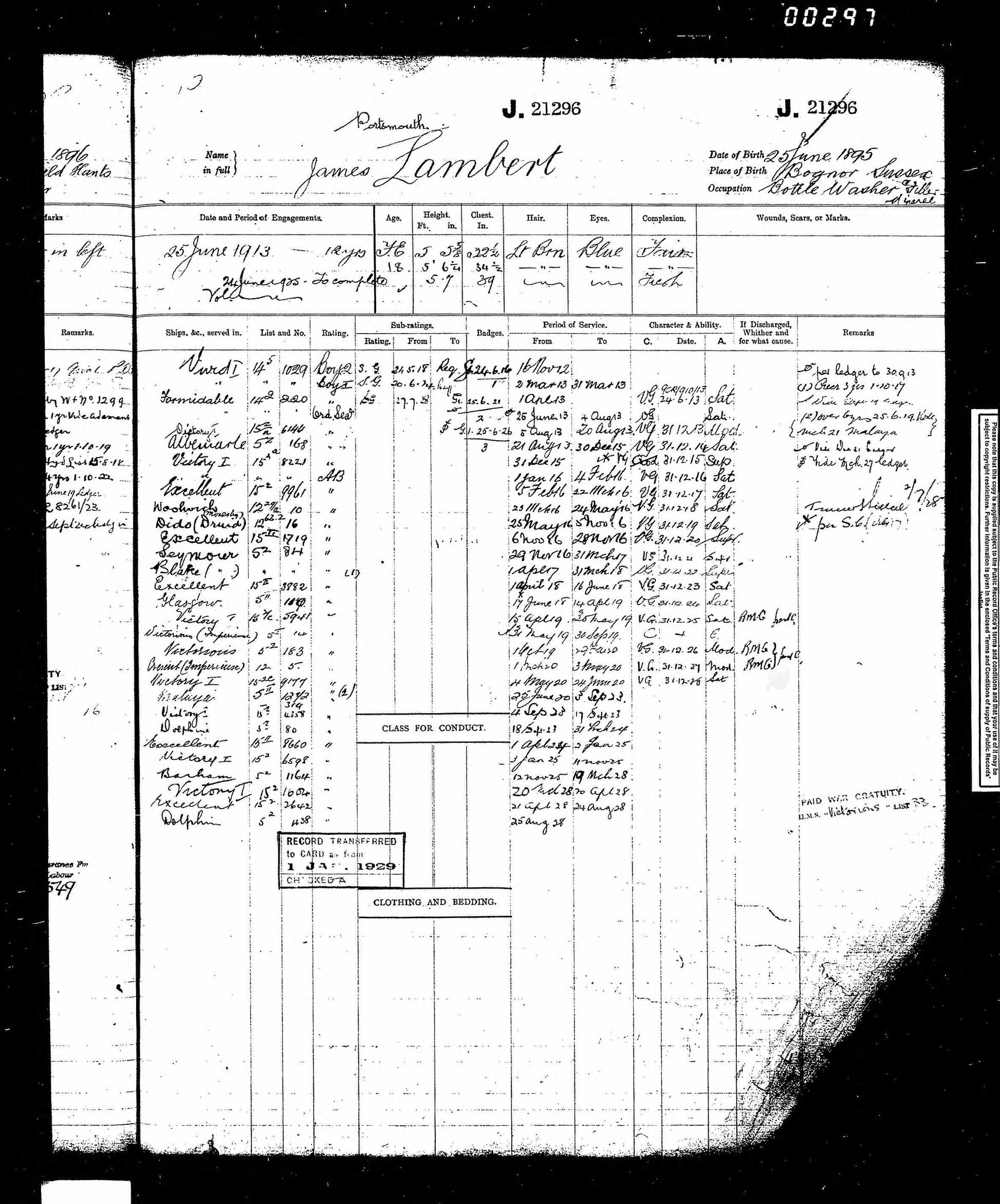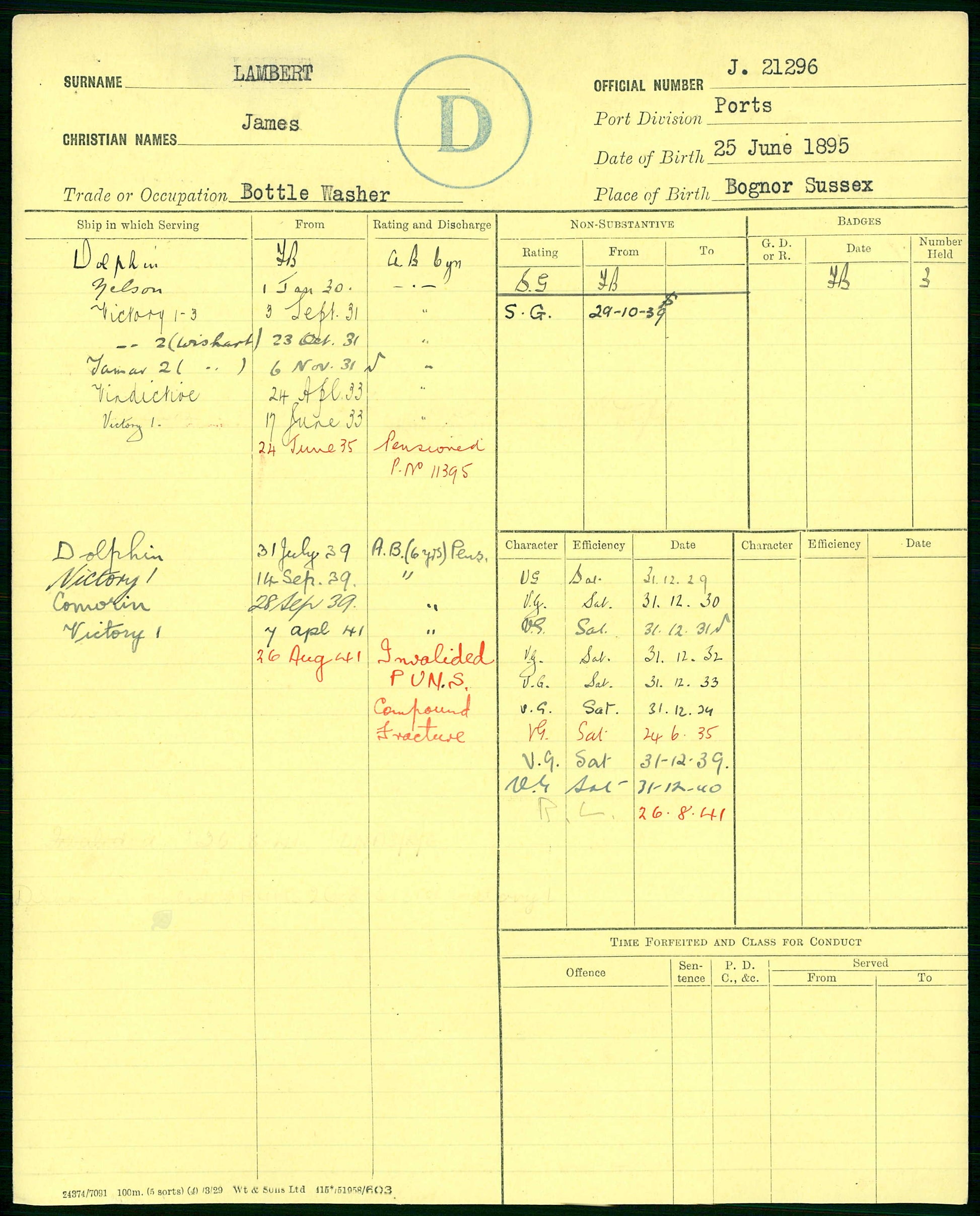 James Lambert was born on 25th June 1895 in Bognor, Sussex. A bottle washer by trade, he enlisted in the Royal Navy on his 18th birthday, 25th June 1913.