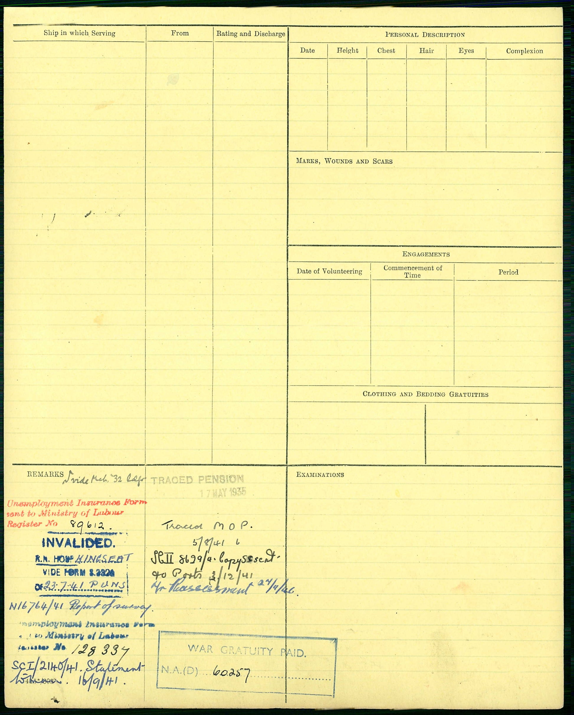 On 6th April 1941, while on escort duty in the North Atlantic, Comorin caught fire in heavy weather and was abandoned. Twenty men were lost, while 455 survivors – including Lambert – were rescued. The following day, the burning wreck was scuttled by HMS Broke. It is almost certain that Able Seaman Lambert sustained the compound fracture which led to his discharge shortly after, on 26th August 1941.