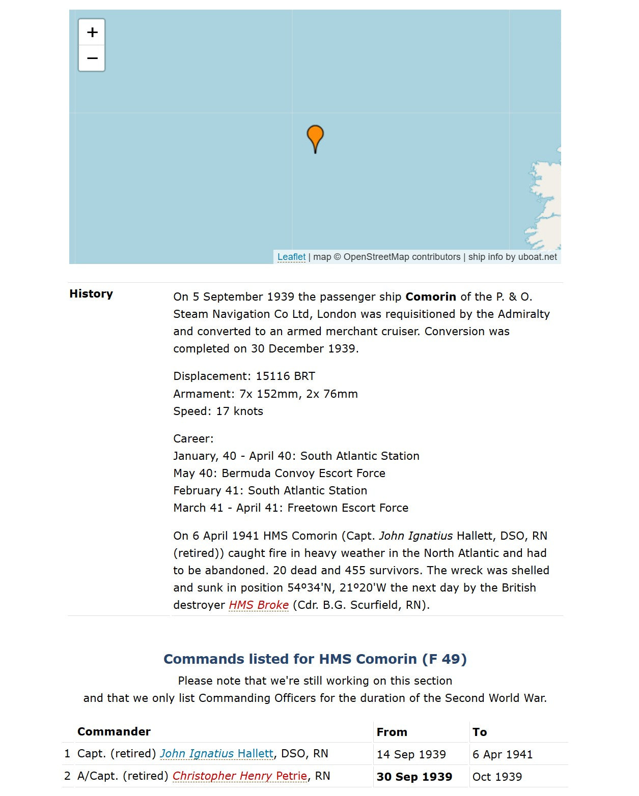 During WW2 he was posted to the Armed Merchant Cruiser HMS Comorin, serving aboard from 28th September 1939 until 6th April 1941.