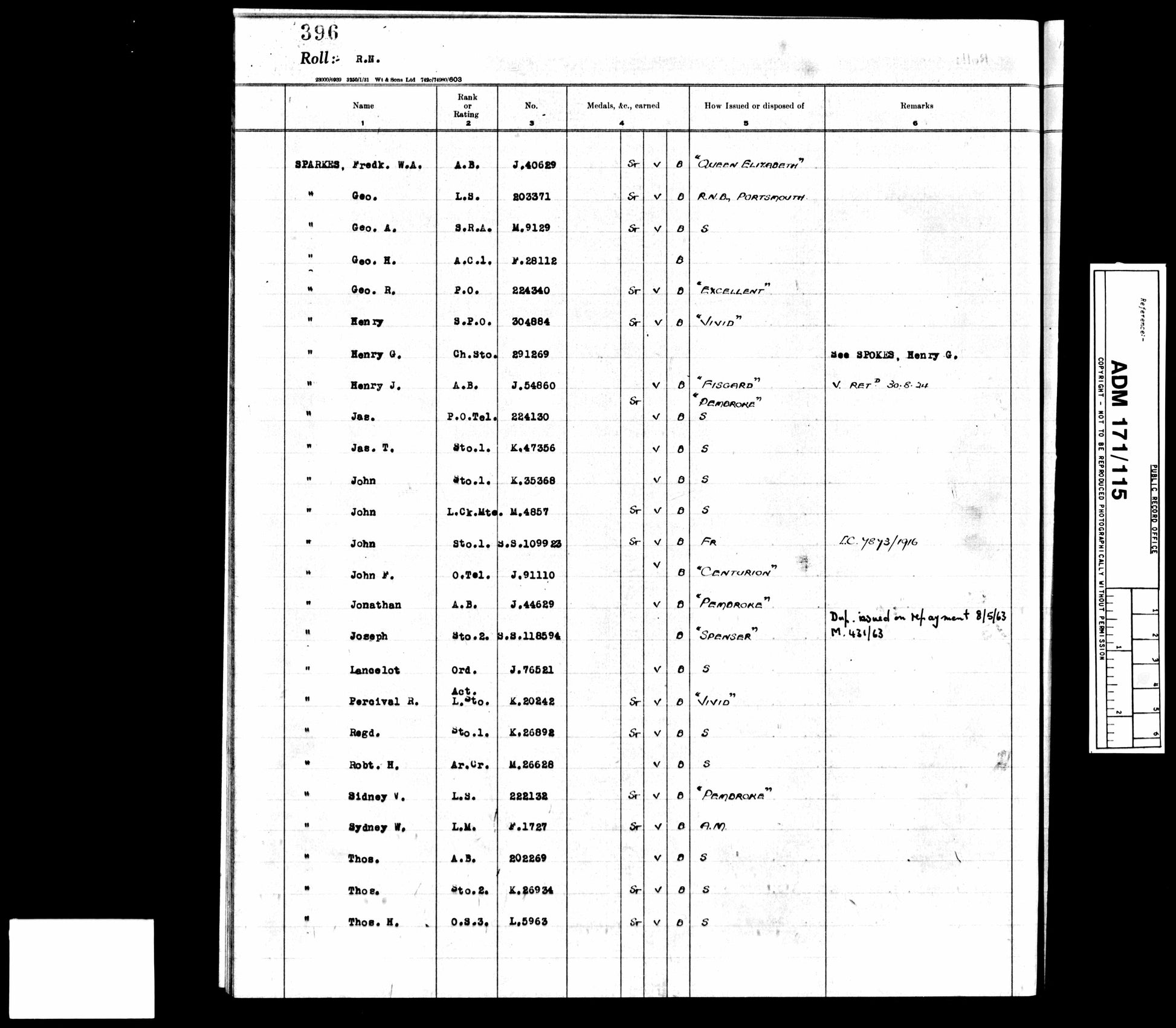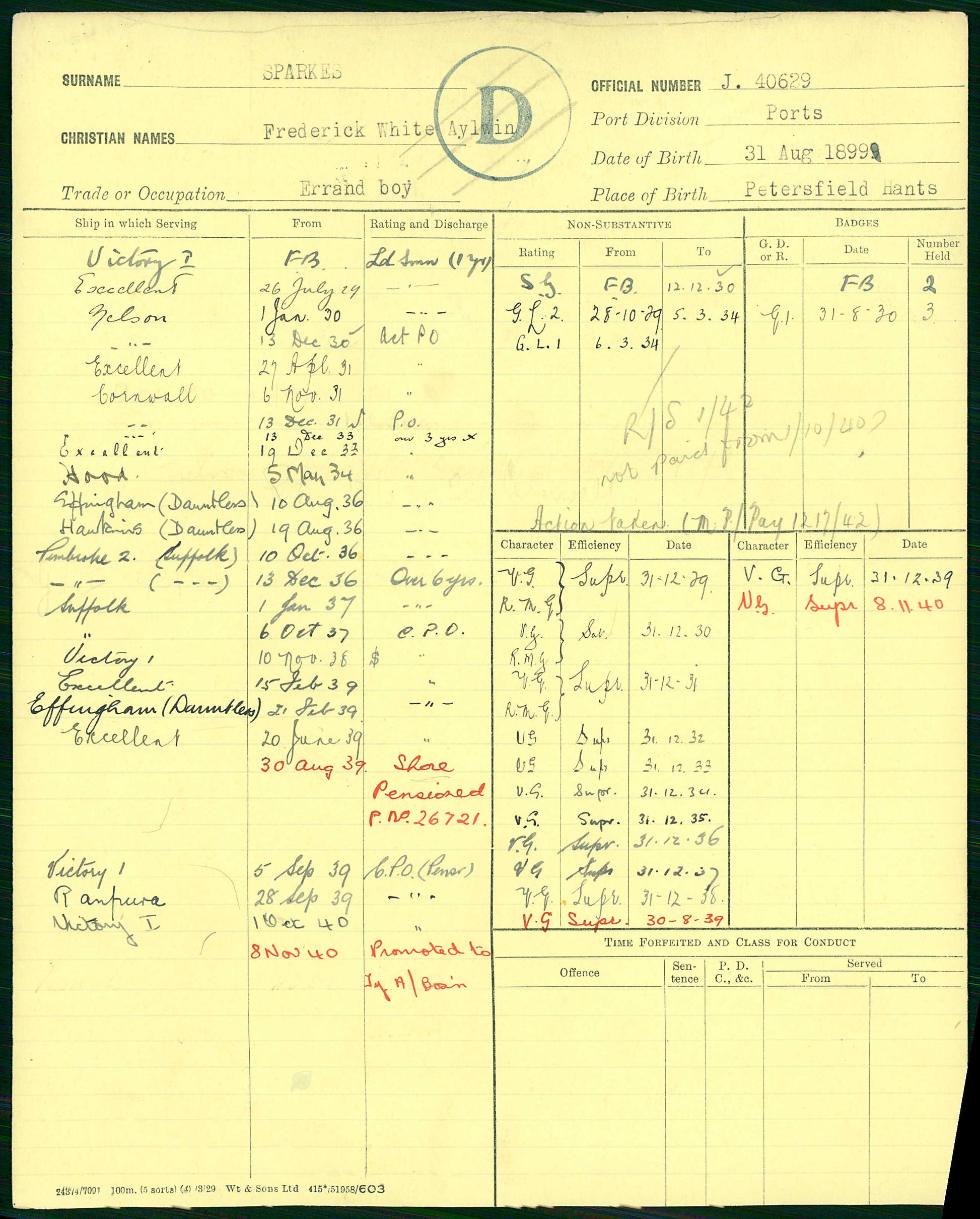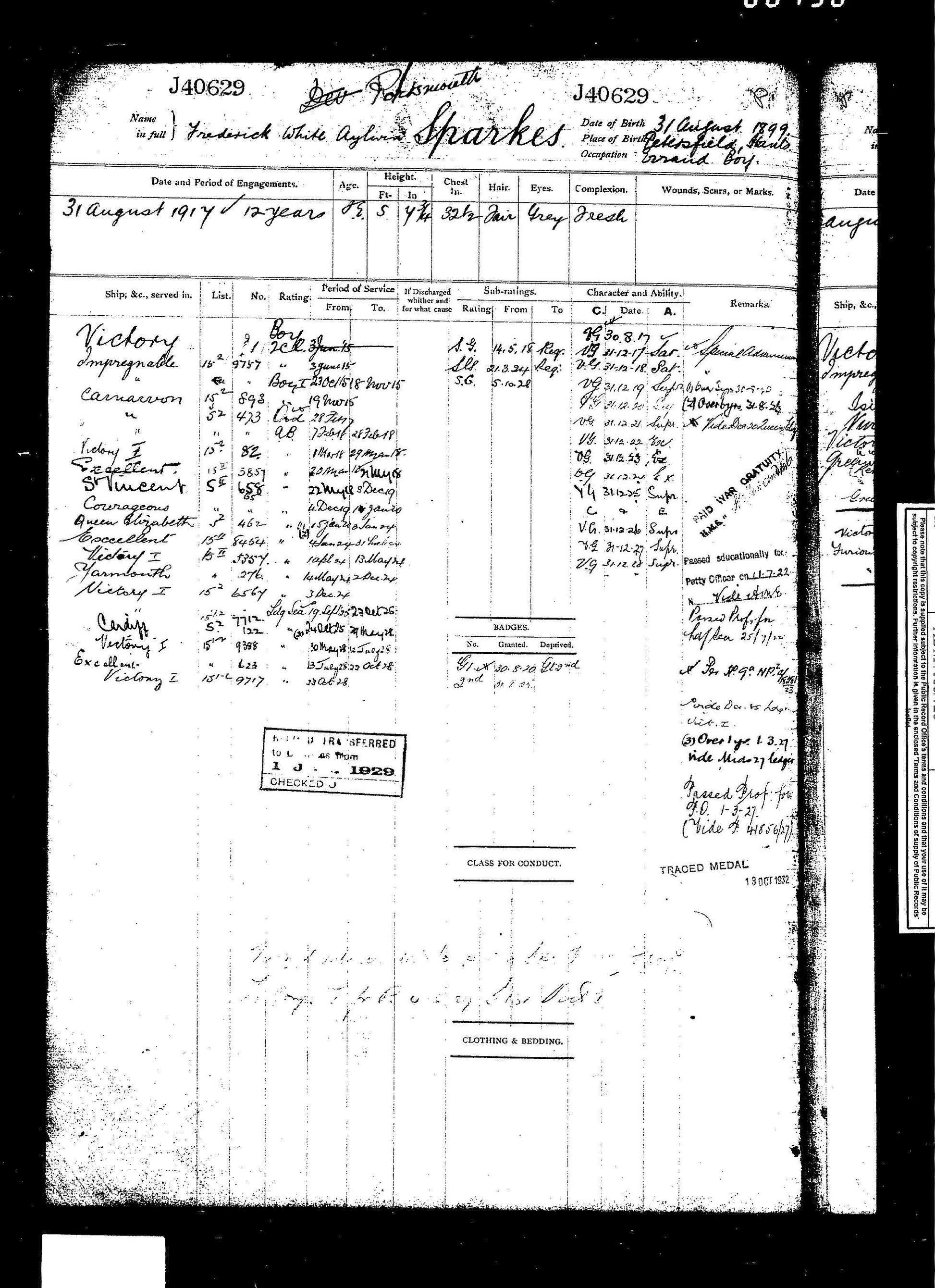 Sparkes was shore pensioned on 30th August 1939, immediately prior to the outbreak of the Second World War. He was later recalled for service and promoted Temporary Leading Seaman on 8th November 1940, again serving at Victory and associated establishments during the war years.