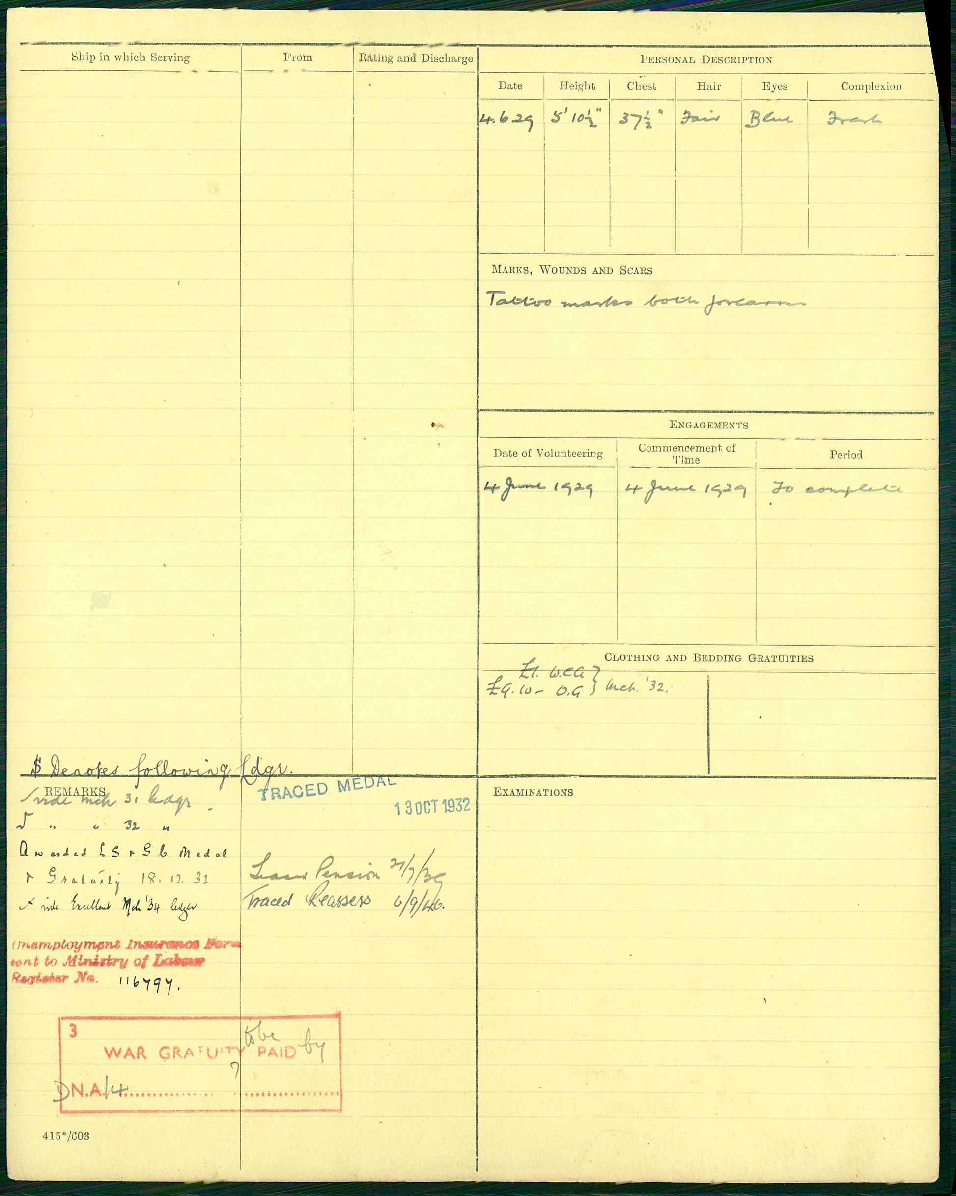He entered the Royal Navy as a Boy in 1915 and then on 31st August 1917 he started his regular service, commencing a twelve-year engagement on his eighteenth birthday. His civilian occupation was recorded as errand boy. On entry he was described as 5 feet 5½ inches in height, with fair hair, grey eyes and a fresh complexion.
