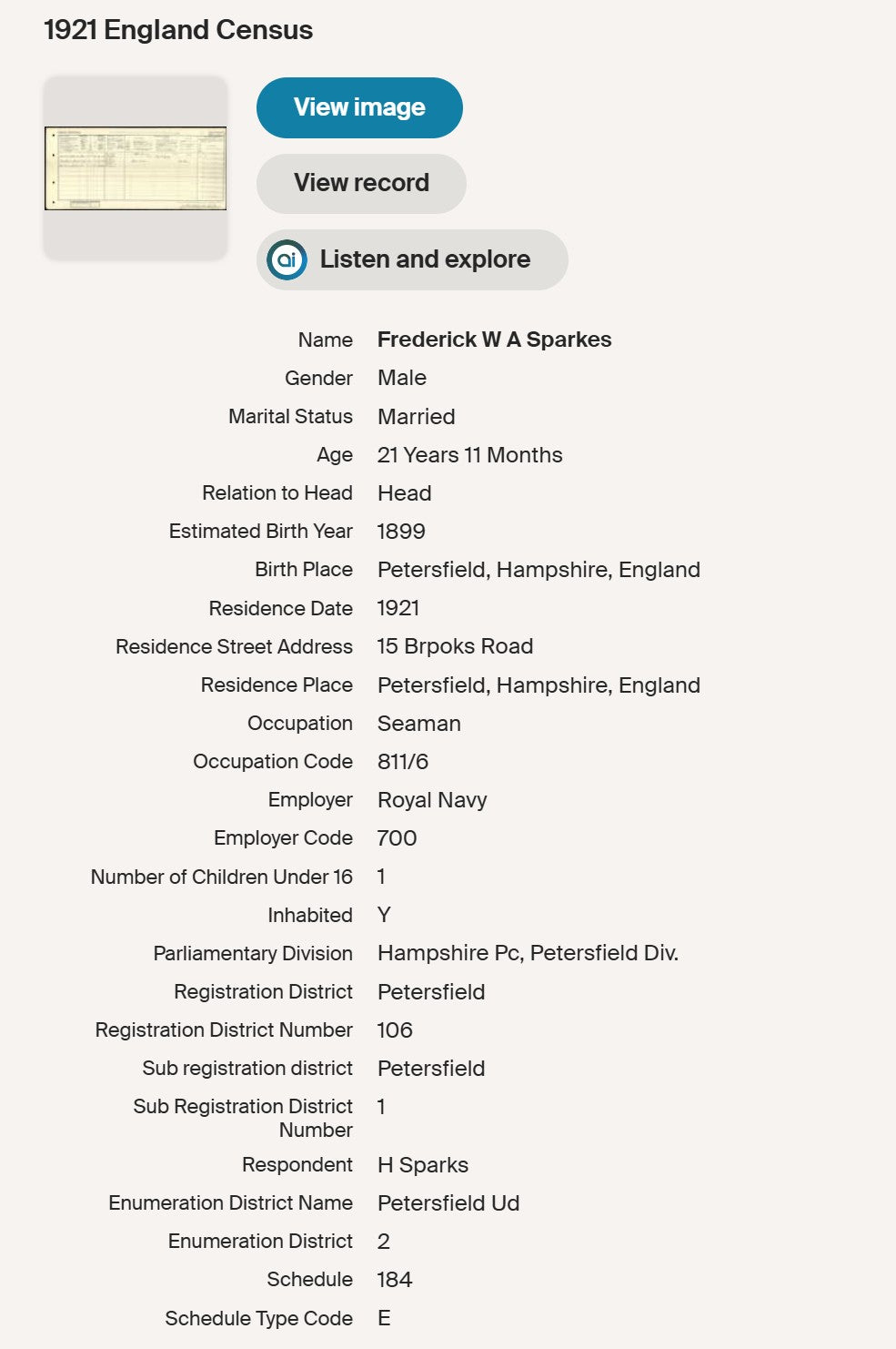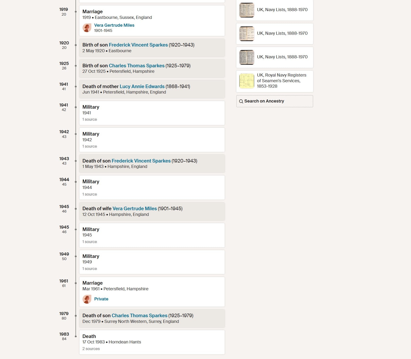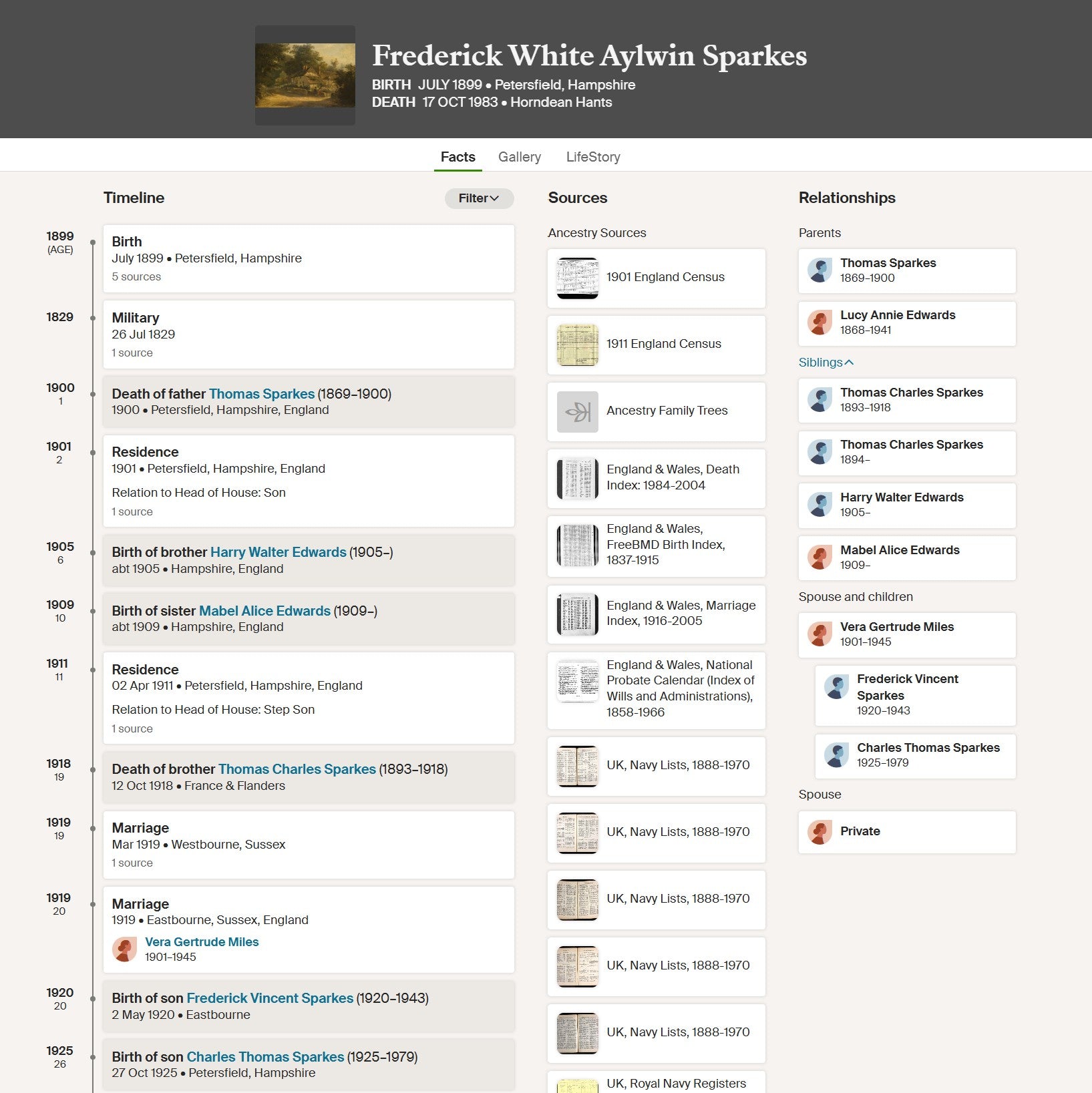 He married Vera Gertrude Miles in 1919 at Eastbourne, Sussex, and by 1921 was residing at 15 Brooks Road, Petersfield, recorded in the census as a Royal Navy seaman and head of household. The couple had at least two sons, including Frederick Vincent Sparkes and Charles Thomas Sparkes.