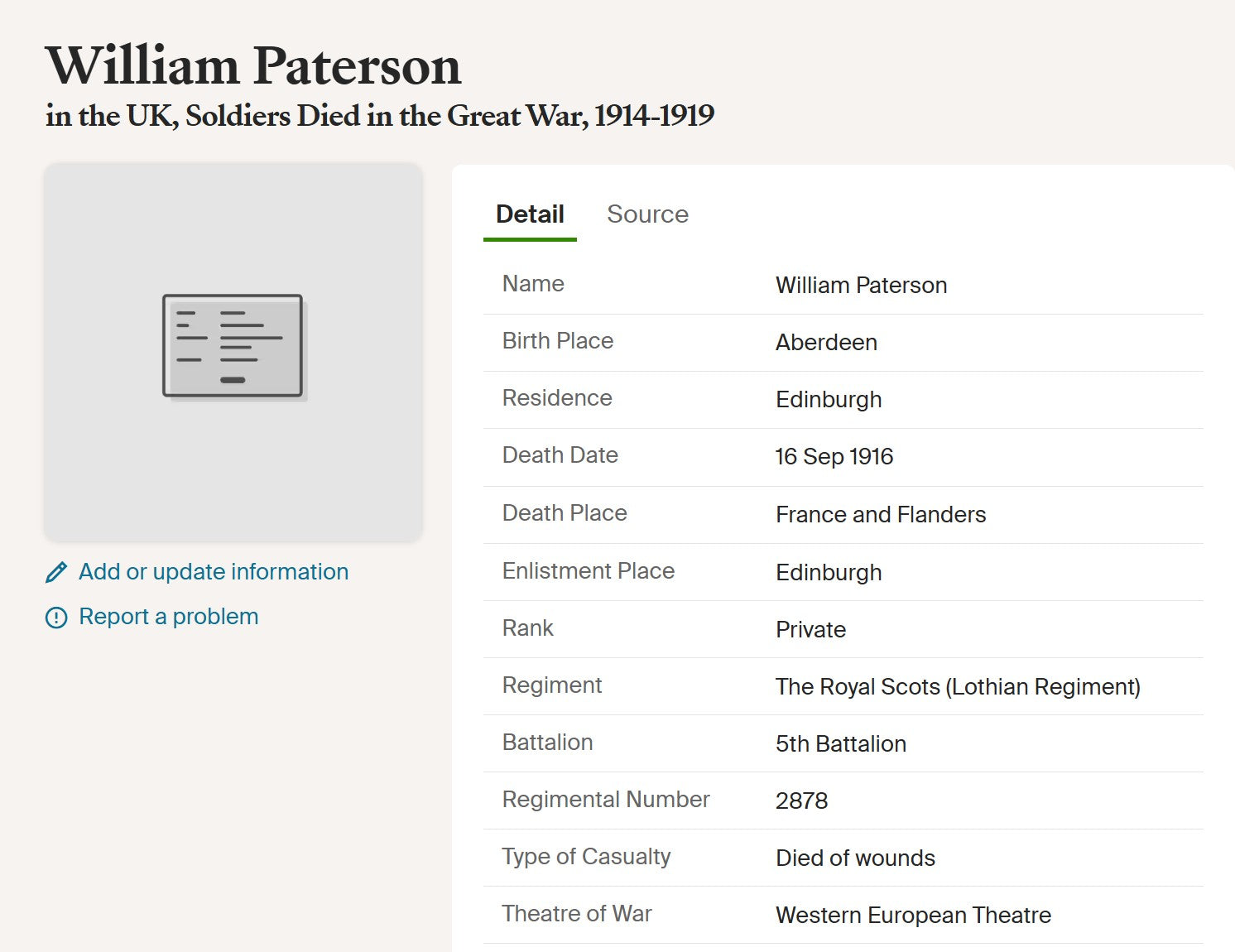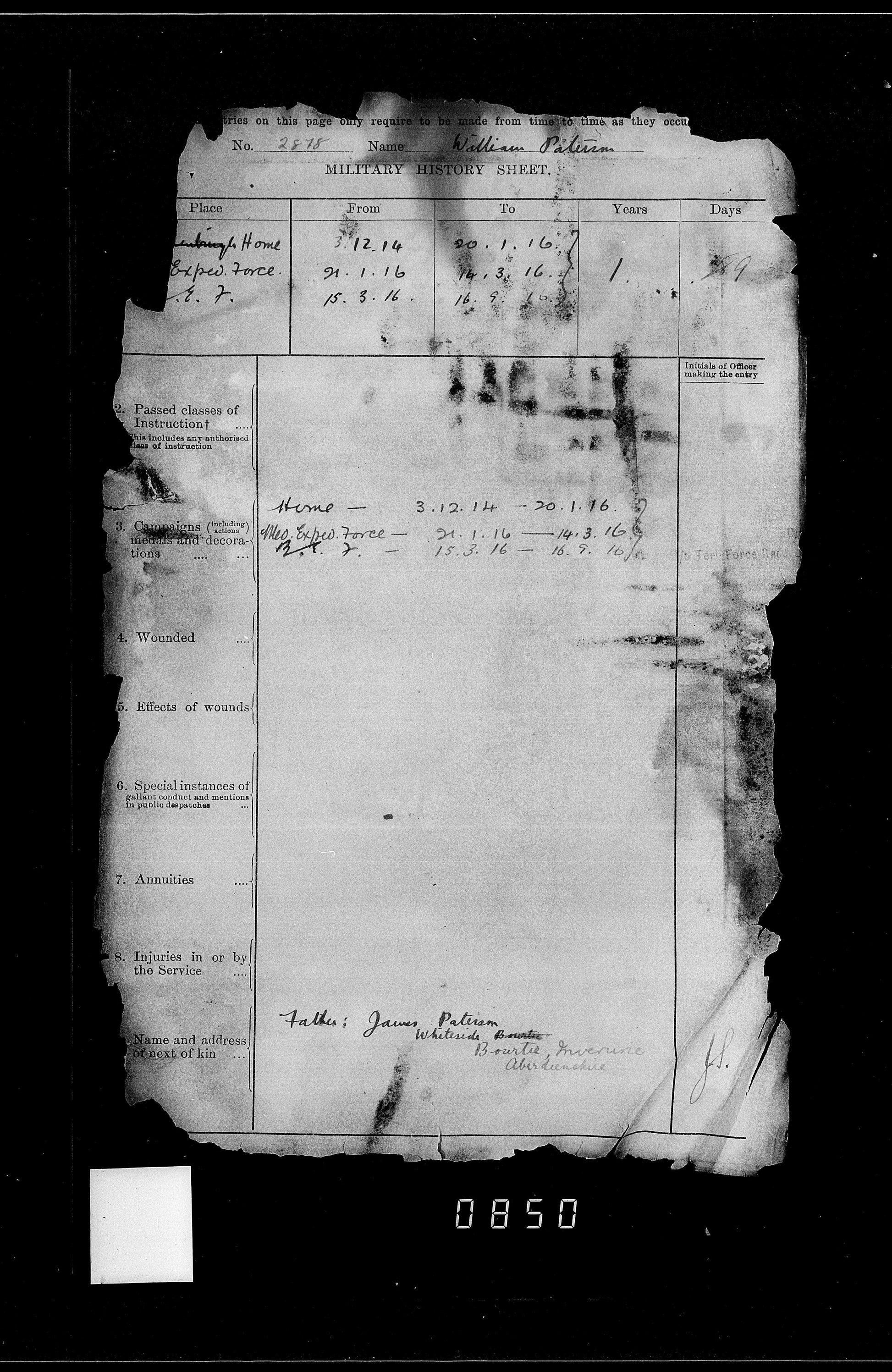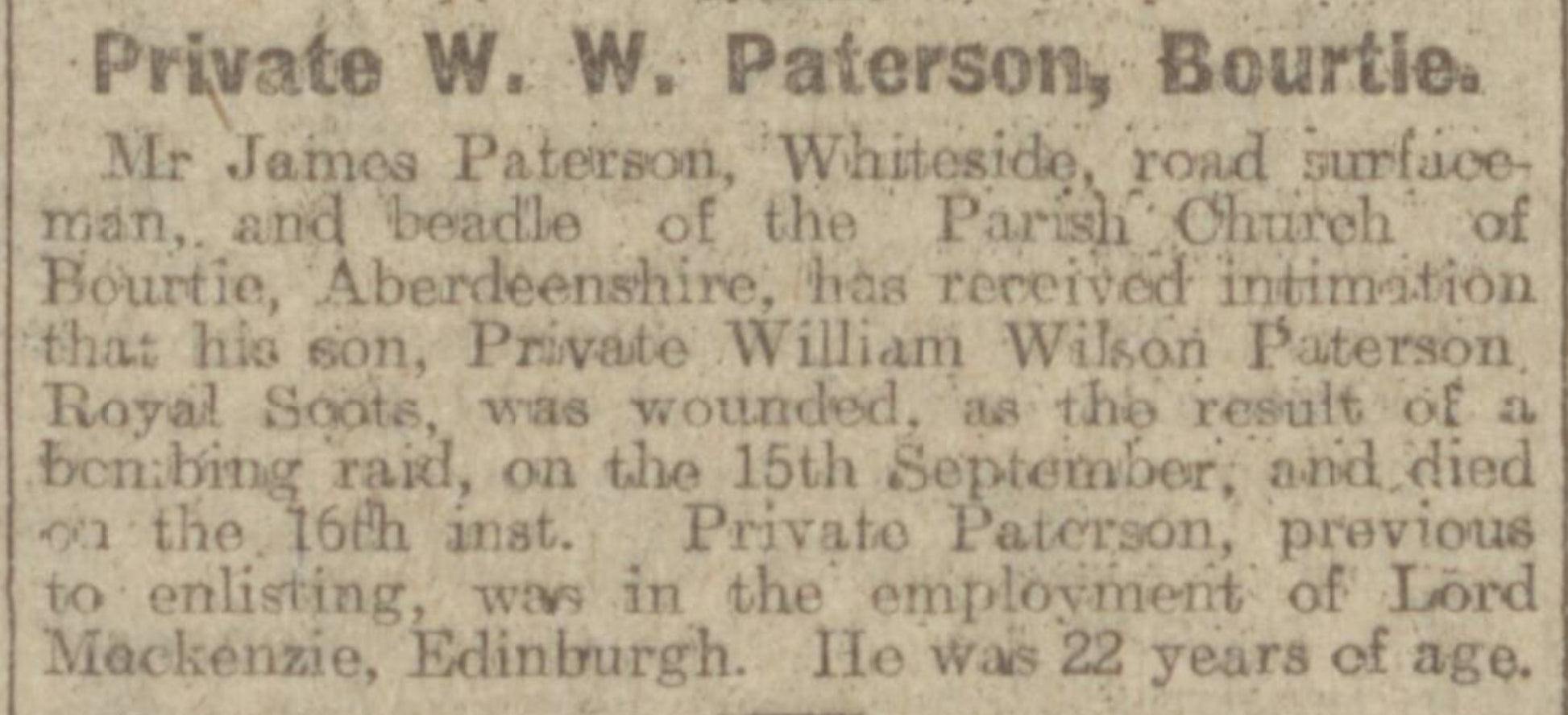 Private William Paterson was Wounded in Action during a Bombing Raid on the 15th September 1916, he died of wounds the next day