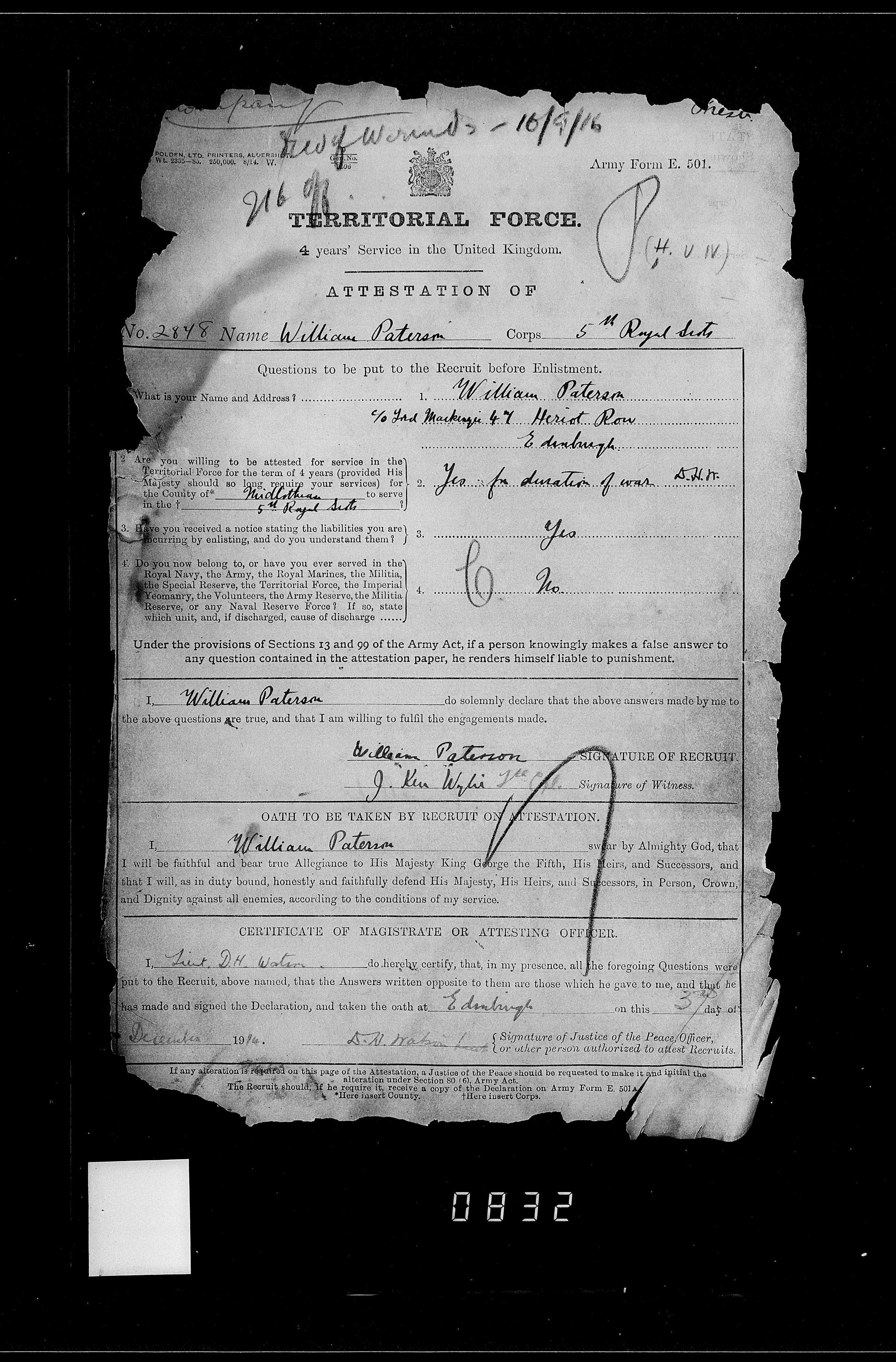 Was working for Lord MacKenzie, a Supreme Court judge Edinburgh when he enlisted into the 5th Bn Royal Scots, 3rd Dec 1914