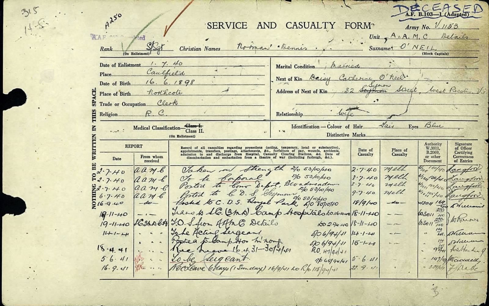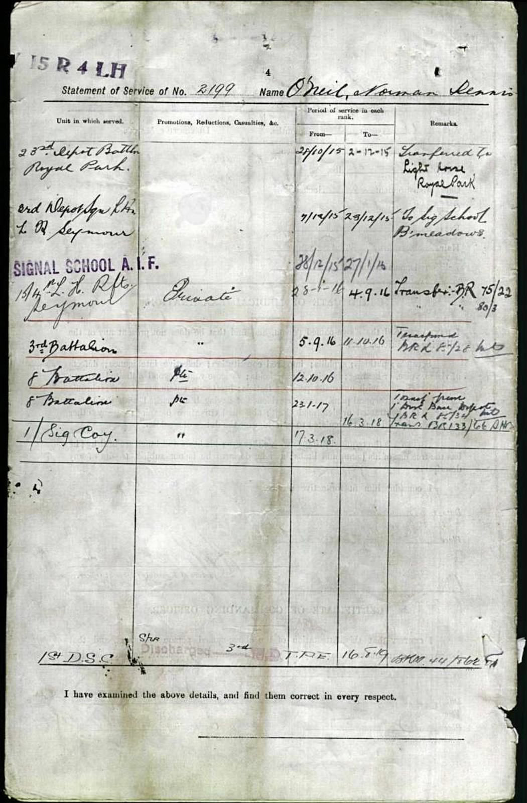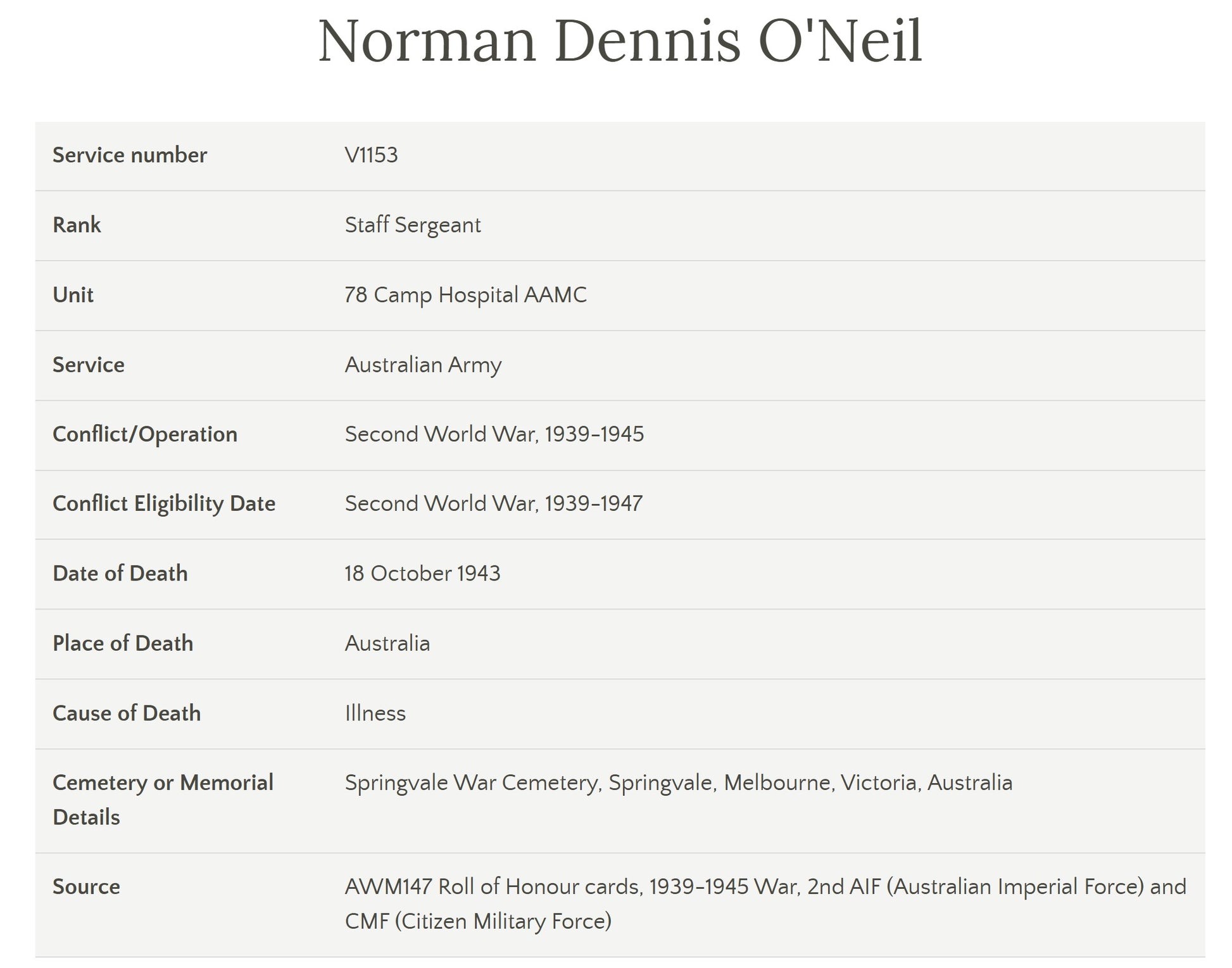 Norman Dennis O’Neil’s life reflected a rare devotion to duty. He was a man who, as a teenager, carried messages under fire on the Western Front, and who, in middle age, gave his skills and leadership once again to his country in its time of need. His service across both world wars — in the mud of Flanders and the hospitals of Victoria alike — stands as a testament to quiet courage, endurance, and lifelong commitment to others.