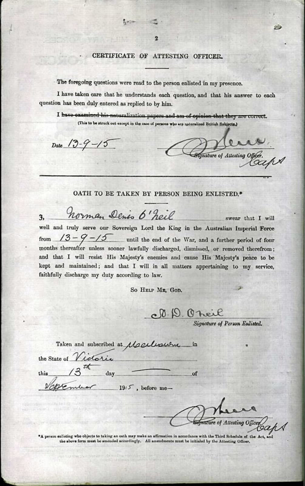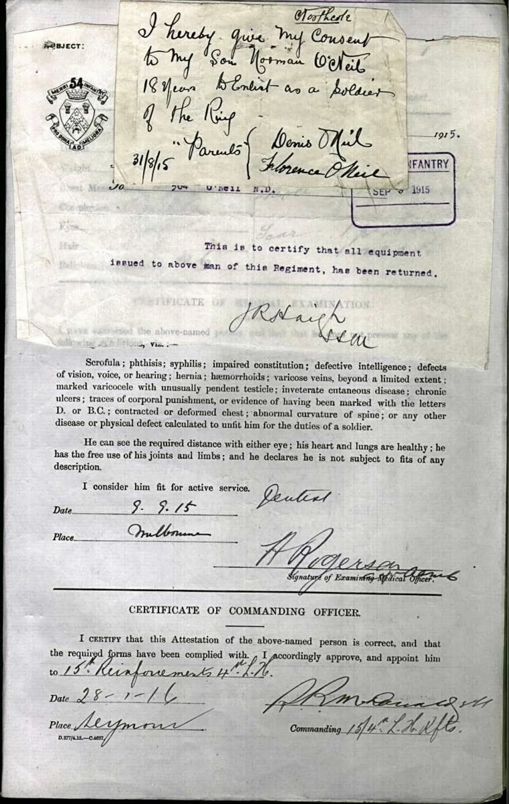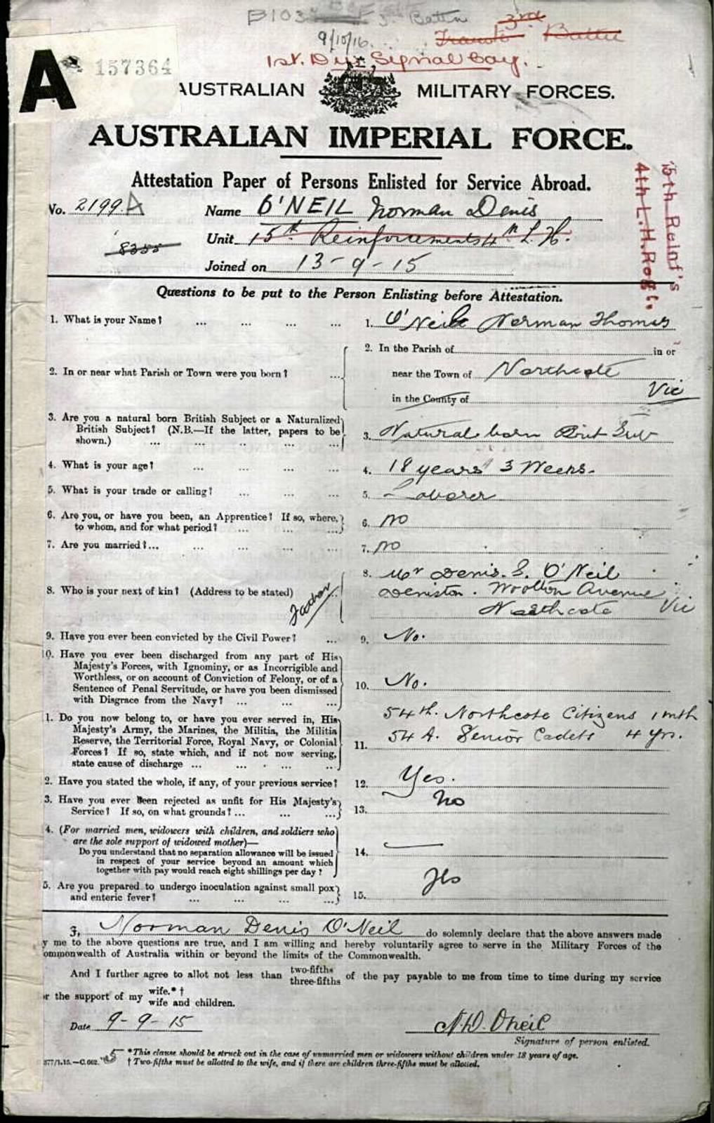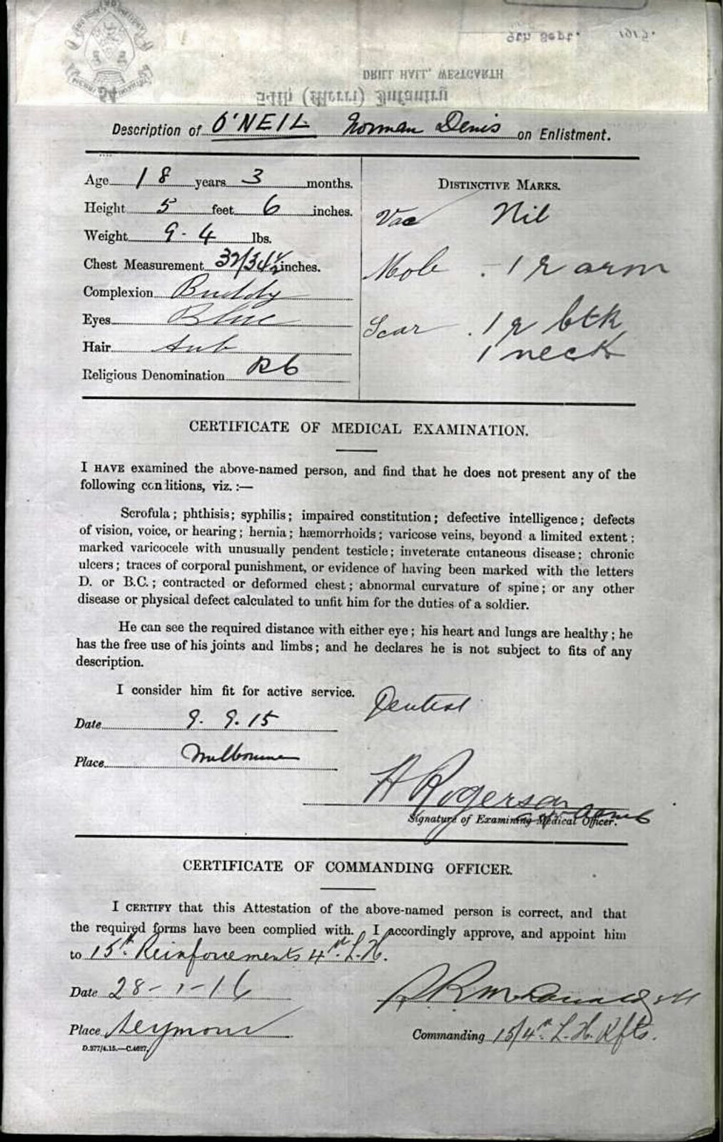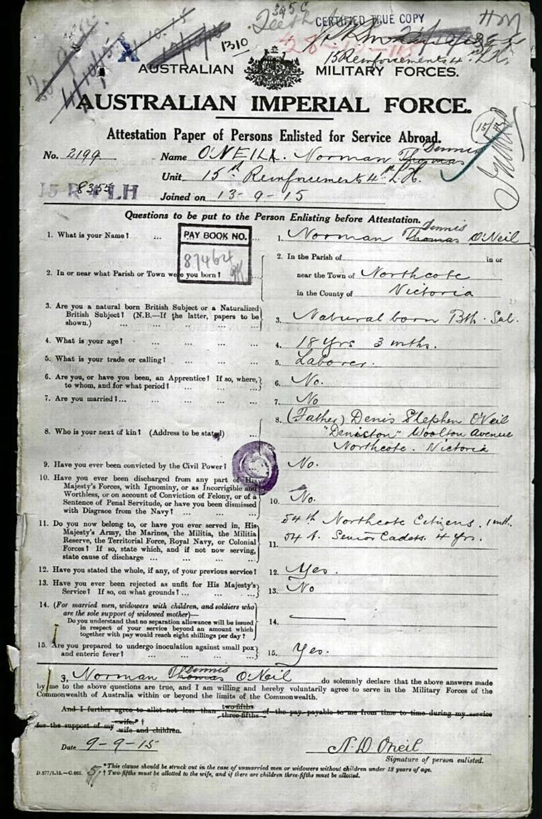 Norman’s first period of service began when he enlisted in the Australian Imperial Force at Melbourne on 13 September 1915, aged just 18 years and three months. He was then a labourer by trade, unmarried, and a member of the Roman Catholic faith. On enlistment he stood 5 feet 6 inches tall, weighed 9 stone 4 pounds, and had fair hair, blue eyes and a ruddy complexion. He bore a mole on one arm and a small scar on the right side of his neck. Declaring his previous service with the 54th Northcote Citizen’s Militia and Senior Cadets, he was accepted for overseas service and assigned the regimental number 2199.