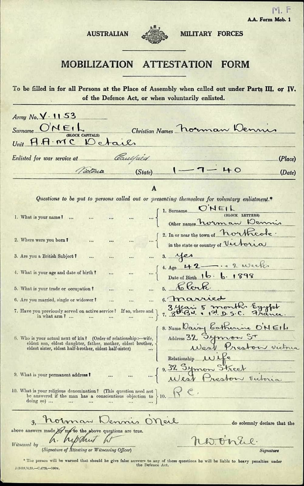 Staff Sergeant Norman Dennis O’Neil (V1153) was born on 16 June 1898 in Northcote, Victoria, the son of Dennis Stephen and Florence Annie O’Neil (née McDonnell). Before the Second World War, he worked as a clerk and lived with his wife, Daisy Catherine Ellen O’Neil (née McAuley), at 32 Symon Street, West Preston, Victoria. The couple had married in 1929, and Norman was remembered by family as a steady and intelligent man who had already served his country once before.