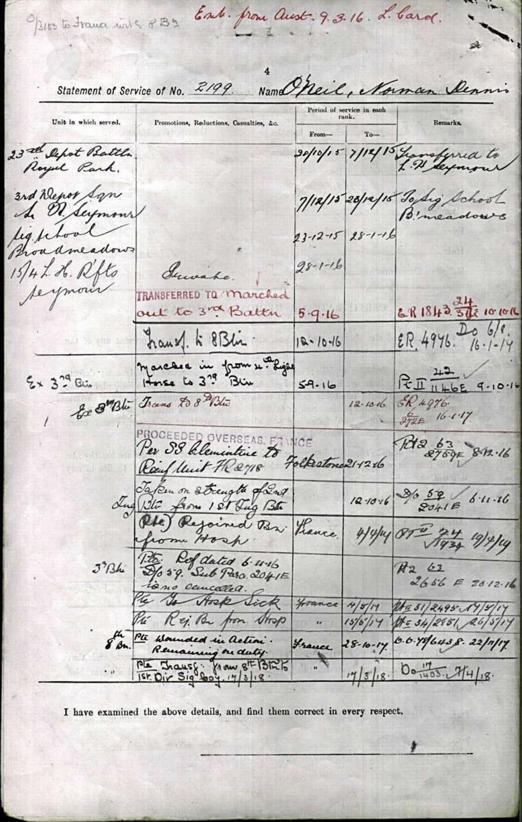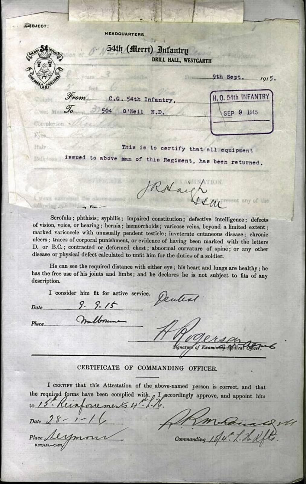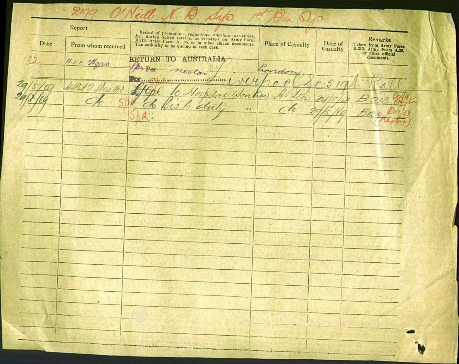O’Neil initially joined the 15th Reinforcements of the 4th Light Horse Regiment, training at Seymour and Royal Park before attending the Signal School at Broadmeadows, where he qualified as a despatch rider. In early 1916 he transferred to the 3rd Battalion and then to the 8th Battalion, serving as a Private. He embarked from Melbourne on 9 March 1916 aboard H.M.T. Corsican, bound for Egypt, before continuing to England later that year, where he trained at Perham Downs on Salisbury Plain. He crossed to France in December 1916 and was taken on strength of the 8th Battalion, Australian Imperial Force, which was then engaged on the Western Front as part of the 2nd Infantry Brigade.
