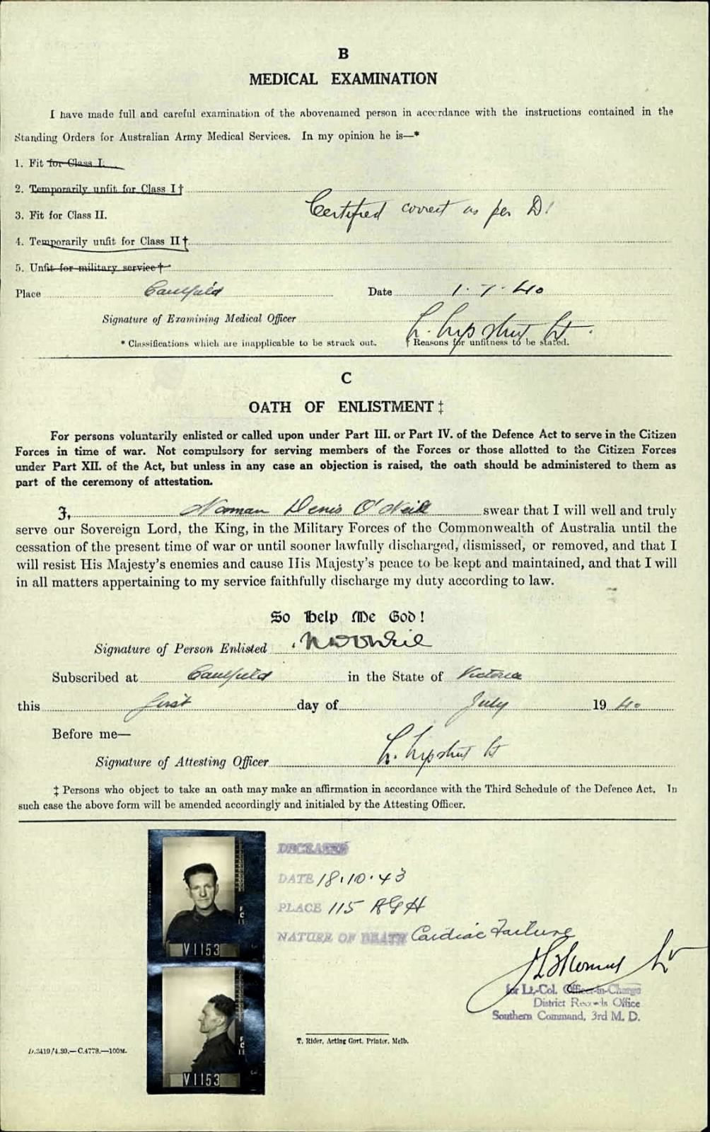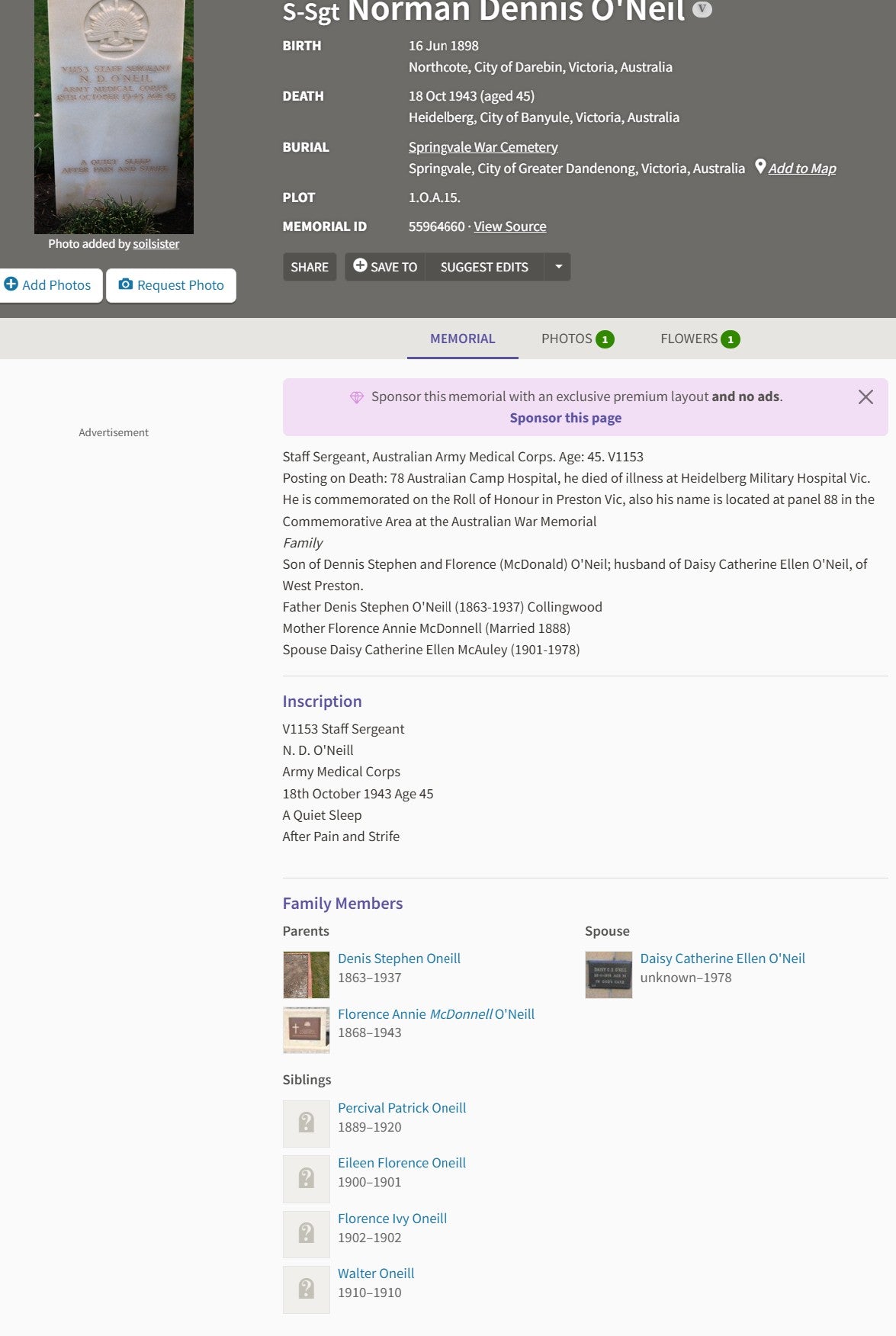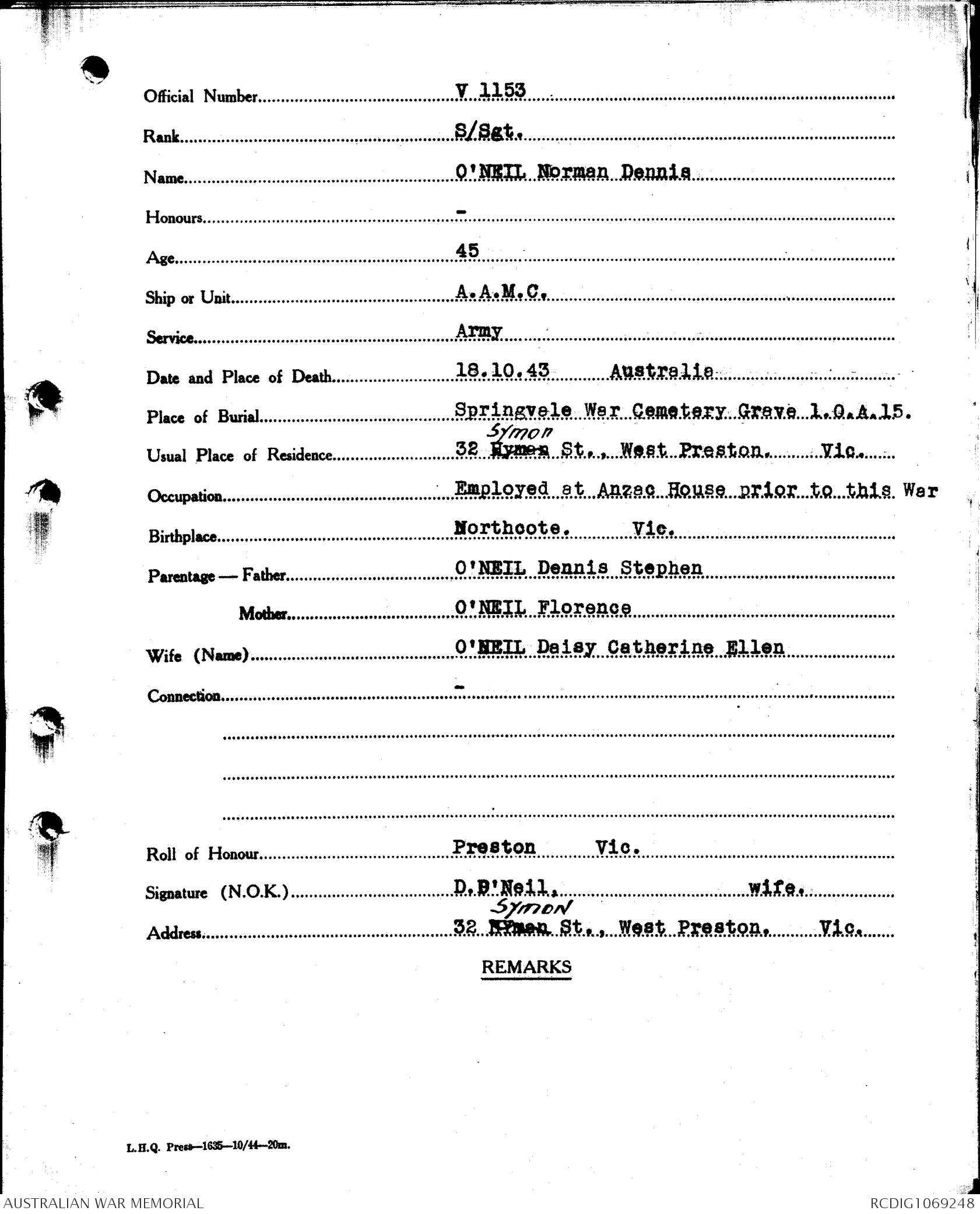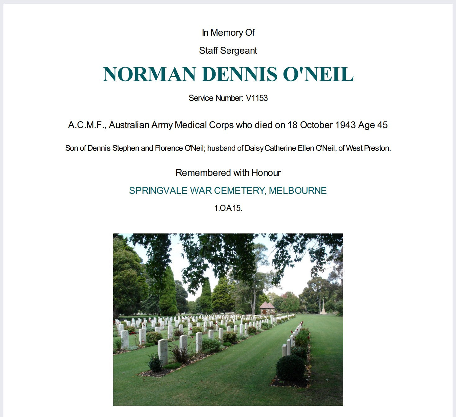He is commemorated on the Roll of Honour at Preston, Victoria, and on Panel 88 of the Commemorative Area at the Australian War Memorial, Canberra. His wife Daisy Catherine Ellen O’Neil, of West Preston, survived him by many years, passing away in 1978.