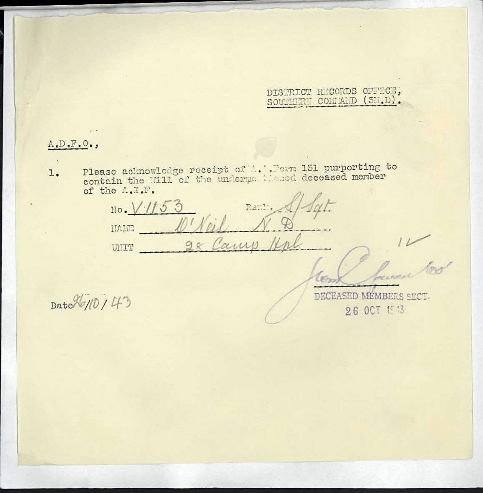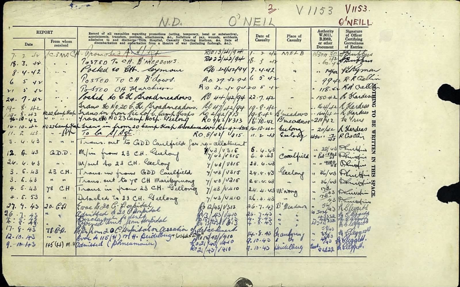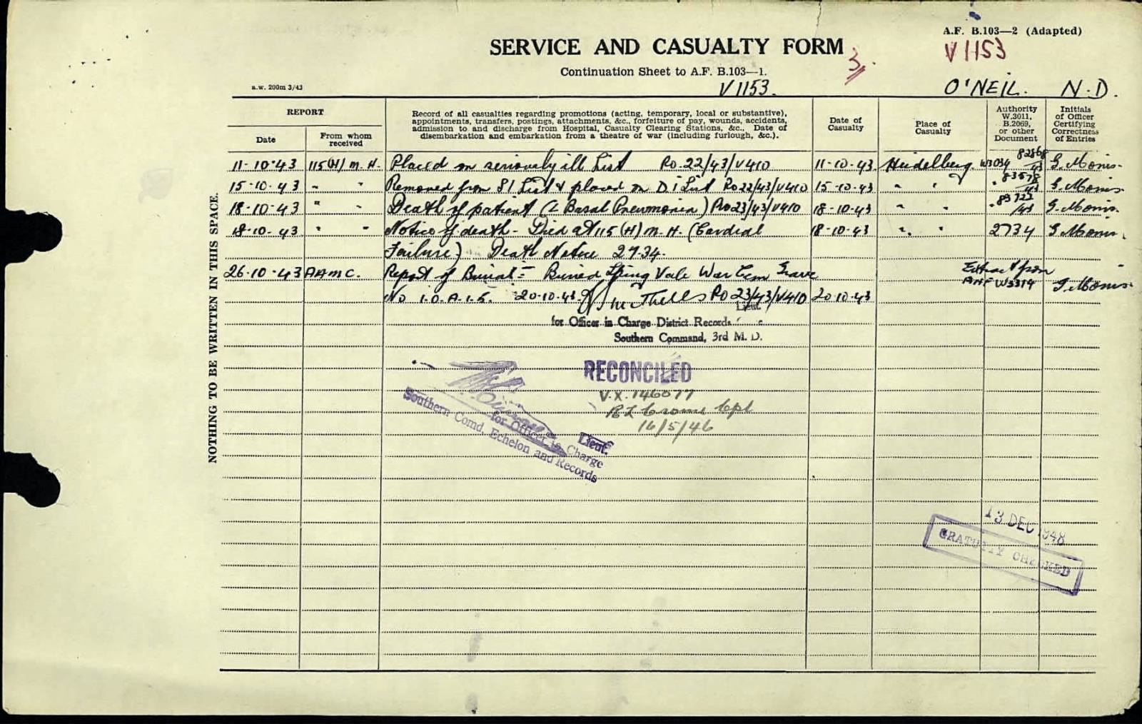 Staff Sergeant O’Neil’s role was largely administrative and supervisory, ensuring that records, supplies and personnel matters were efficiently managed in the busy wartime hospitals caring for soldiers from across the state. His steady nature and long experience of military life made him a valuable senior non-commissioned officer. Unfortunately, after several years of devoted home-front service, his health began to fail. He was admitted to the 115th Australian General Hospital, Heidelberg, suffering from heart trouble, and died there on 18 October 1943 from cardiac failure. He was 45 years old.