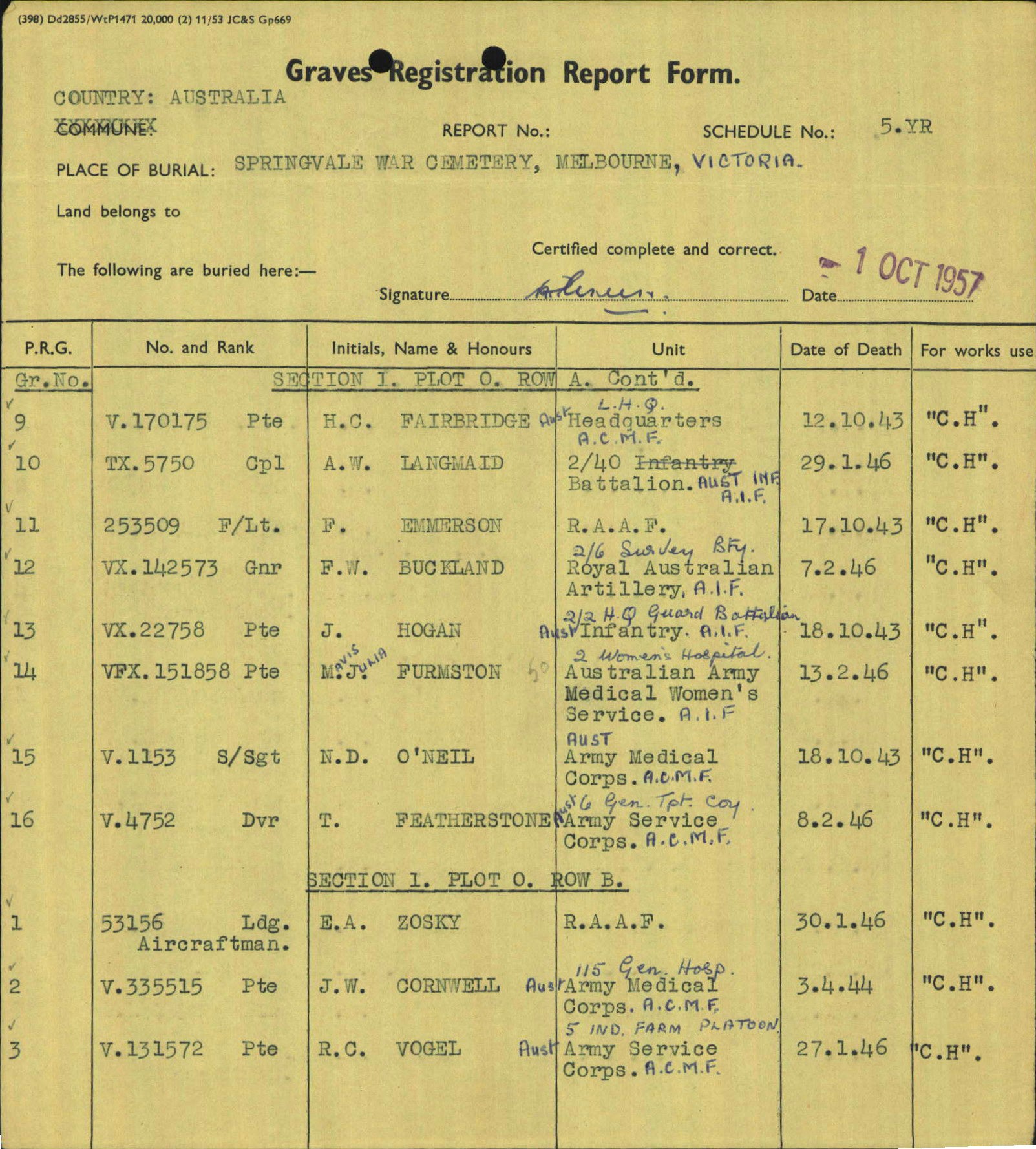 He was buried with full military honours in Springvale War Cemetery, Melbourne (Plot 1.O.A.15), where his headstone bears the simple but fitting inscription: