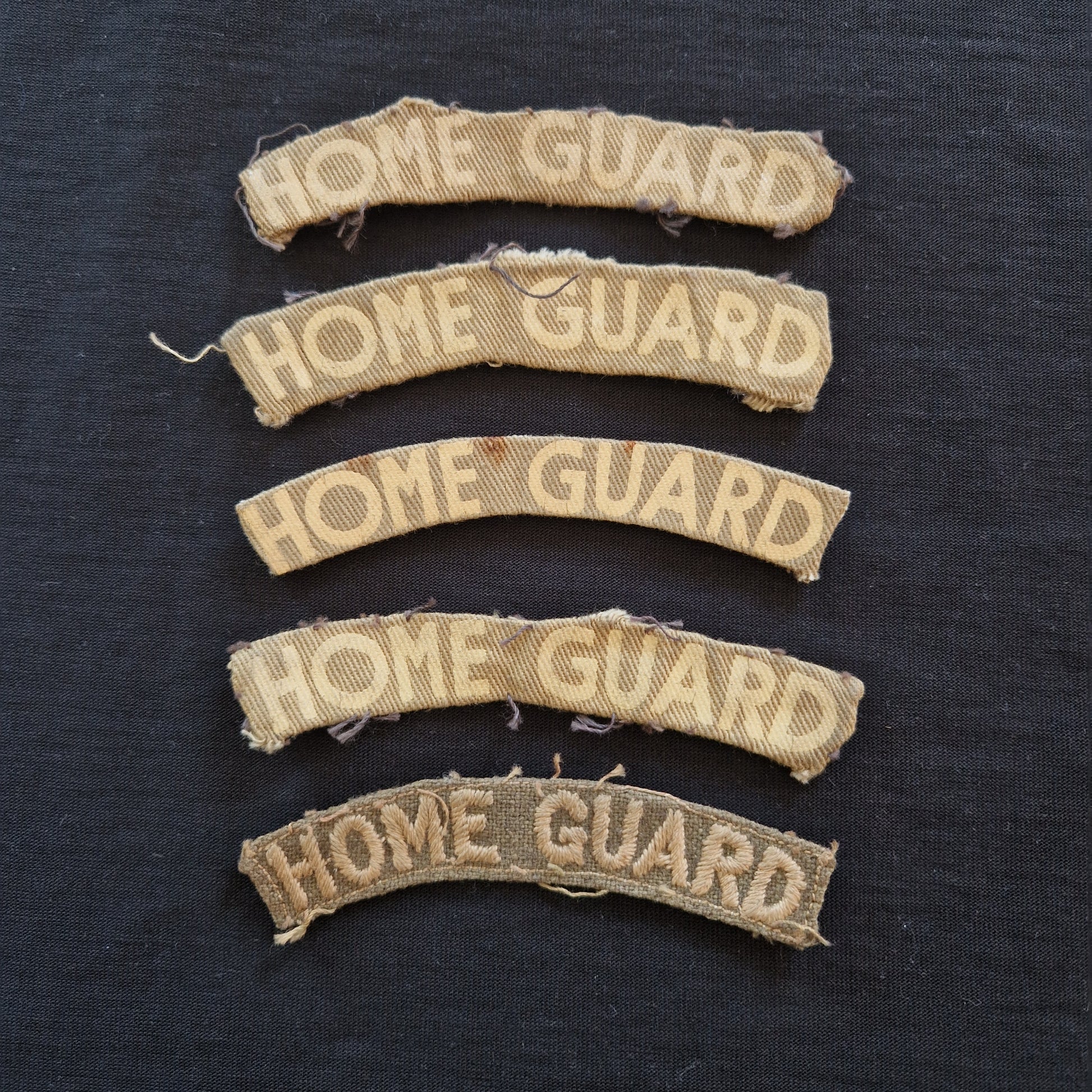 An original group of five WWII British Home Guard cloth shoulder titles, consisting of four printed and one woven example. All are 100% genuine wartime pieces, removed from original uniforms and showing period wear consistent with service use.