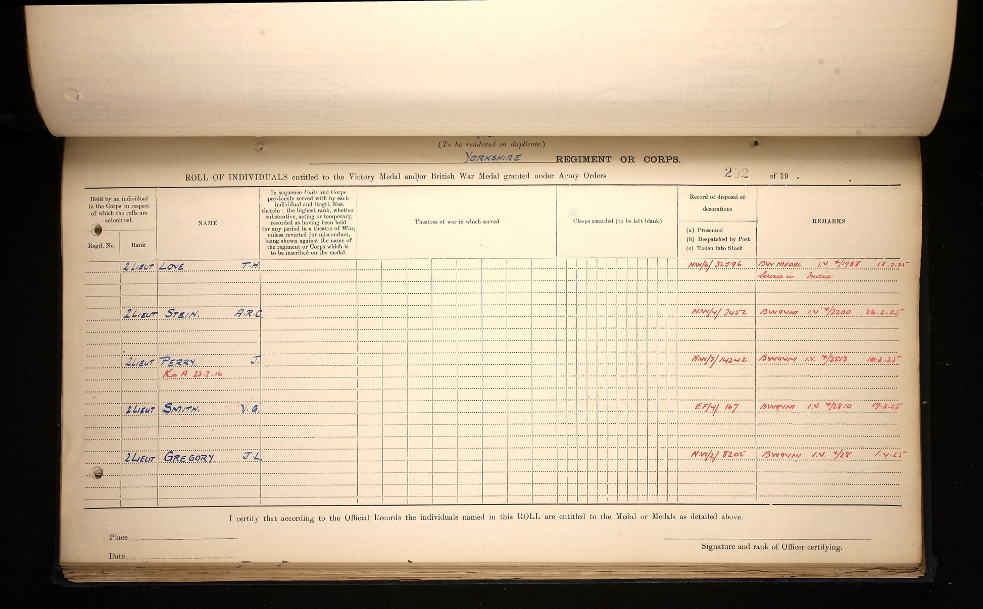 Joined Public Schools Battalion of the Royal Fusiliers in February 1915, commissioned Yorkshire Regiment November 1916