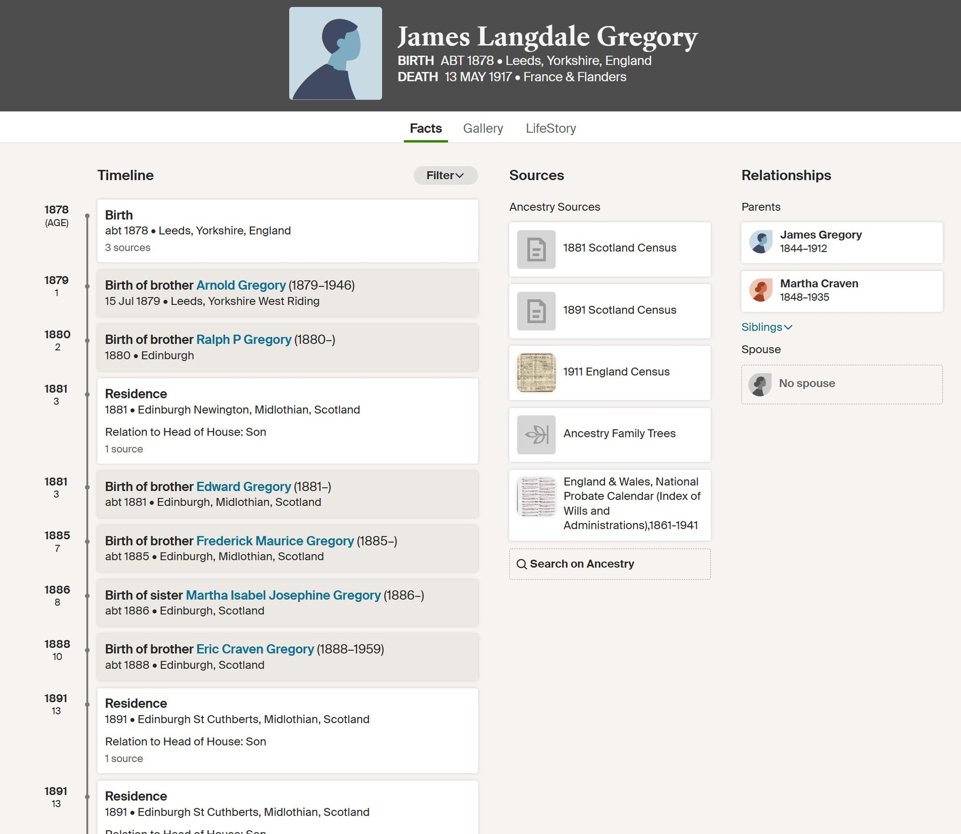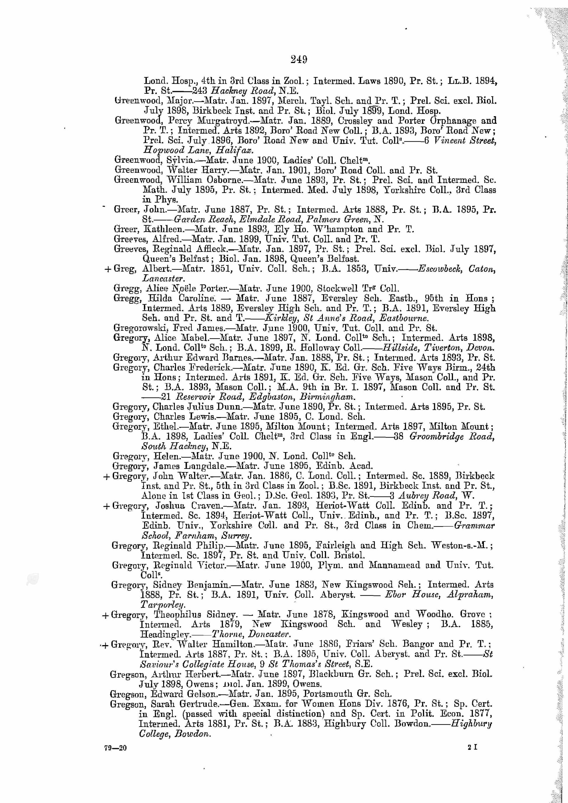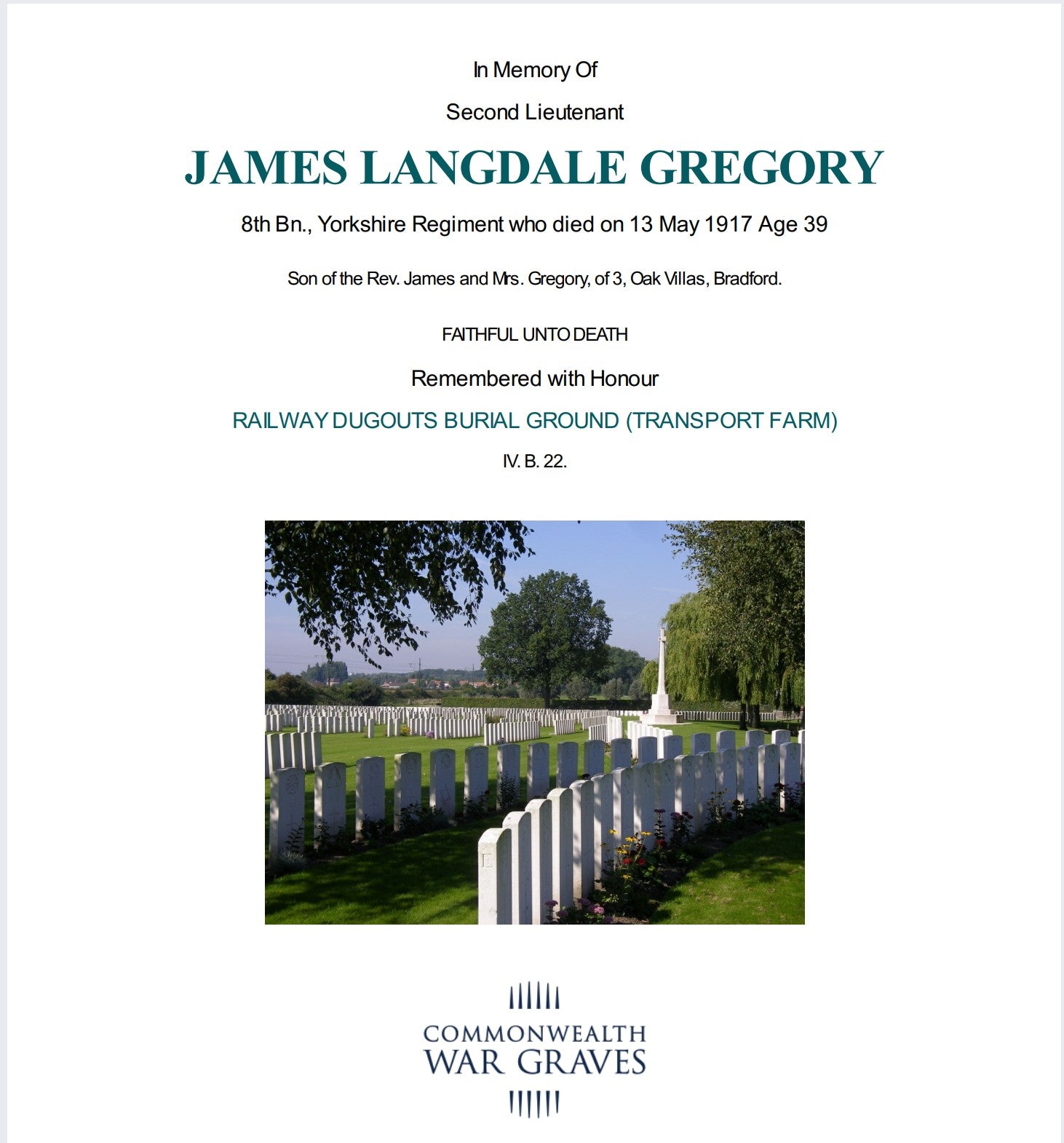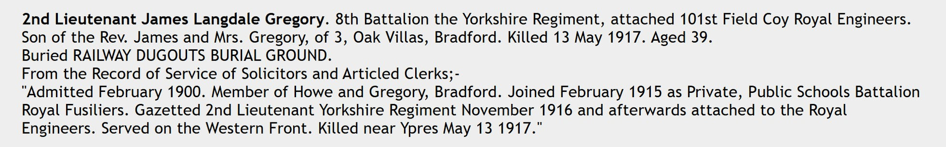 Son of Reverend James and Mrs Gregory of 3 Oak Villas Bradford